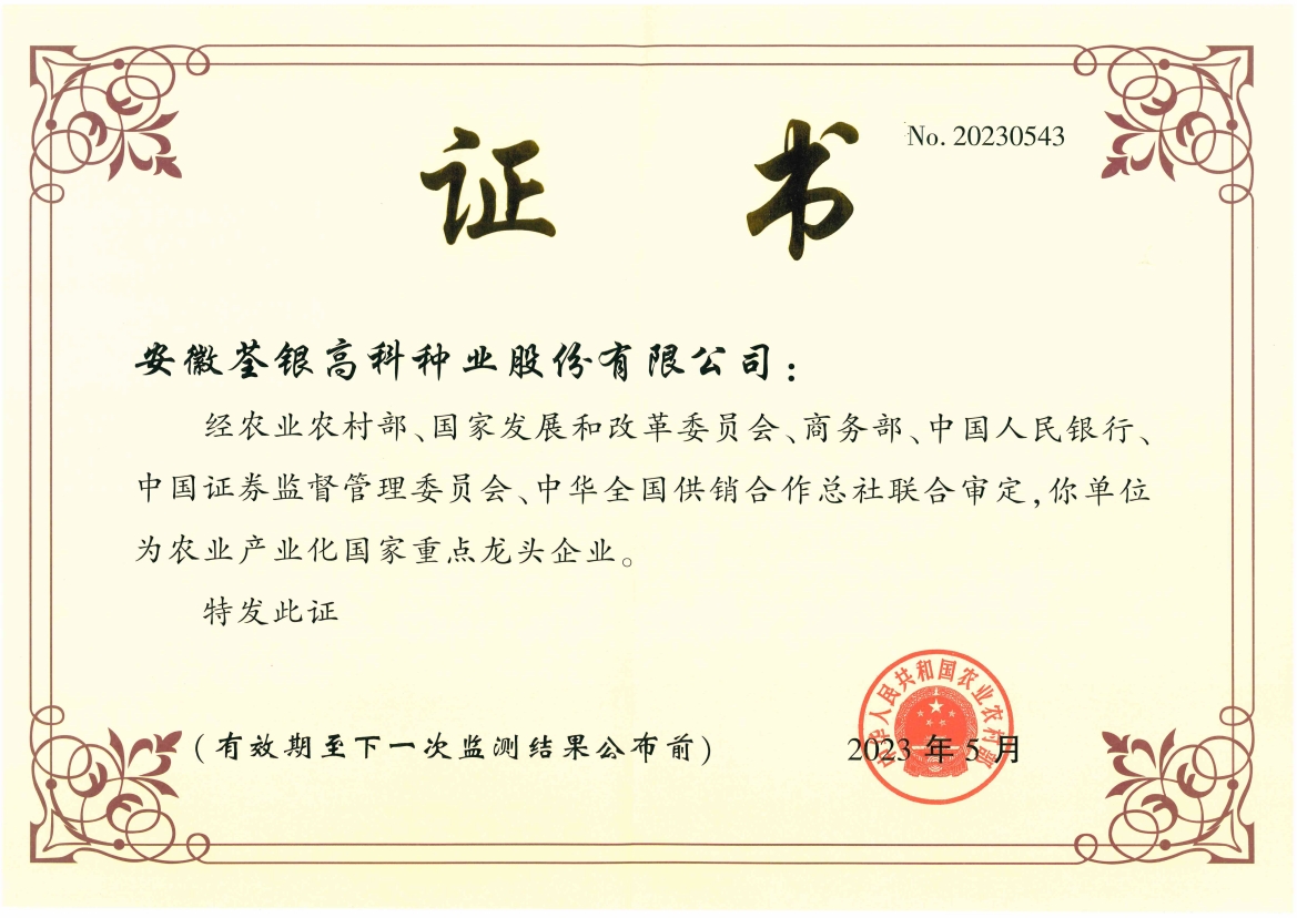 安徽荃銀高科種業股份有限公司是一家“以種業為核心、農業服務為延伸、探索和創新農業多元化發展”的現代高科技種業上市公司,證券代碼:300087。公司注冊資金9.47億元,系“中國種業領軍企業、農業產業化國家重點龍頭企業、國家高新技術企業、農業部首批農作物種子育繁推一體化企業、中國種業信用明星企業"。在國內控股子公司20多家,在國外設立分支機構4家,良種銷售至全國20多個?。ㄊ小^),出口覆蓋20多個國家與地區,種業綜合實力、雜交水稻研發、推廣及海外業務規模均居全國種子企業前2位。